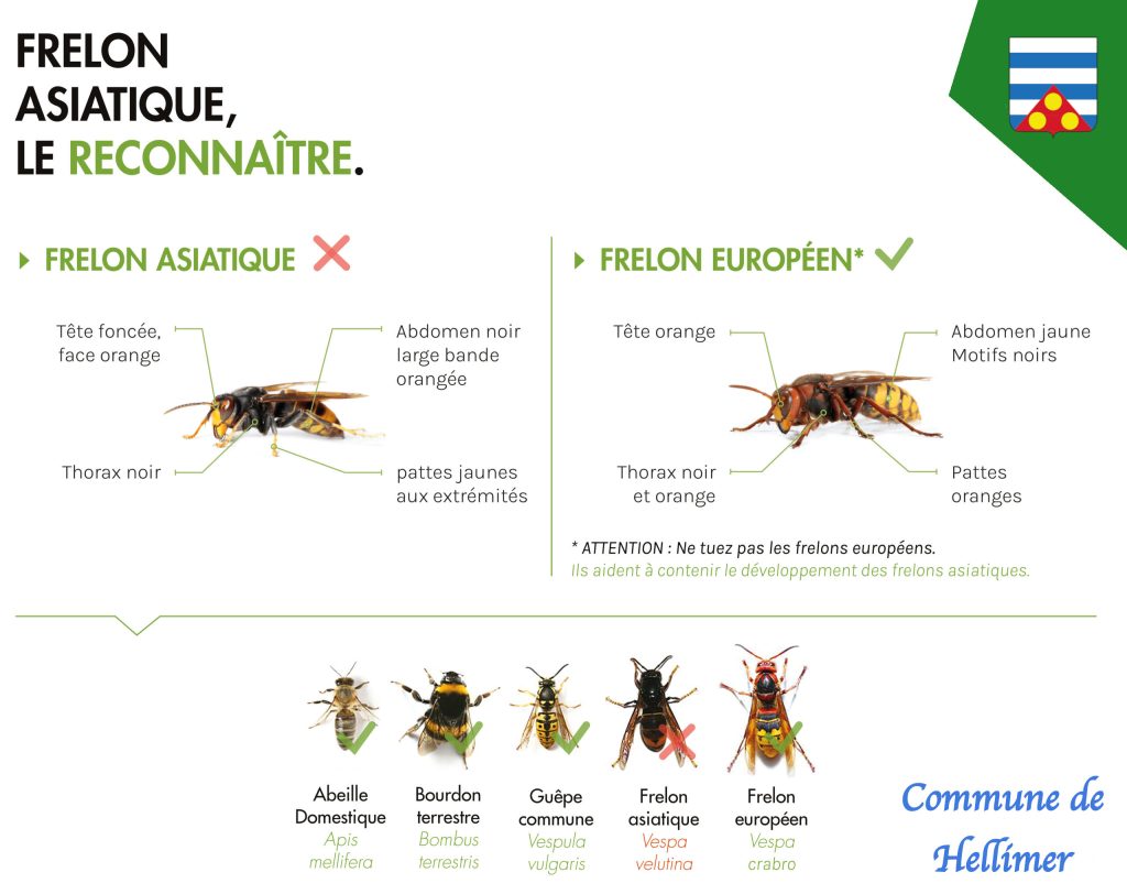 Le frelon asiatique est une espèce exotique et envahissante qui peut provoquer la destruction de nombreuses colonies d’insectes et d’abeilles. On reconnait l’insecte à sa teinte noire, et à la bande orange sur l’abdomen. Il est plus gros que les guêpes et les abeilles (entre 17 et 32 mm), et sa tête vue de face est orange.